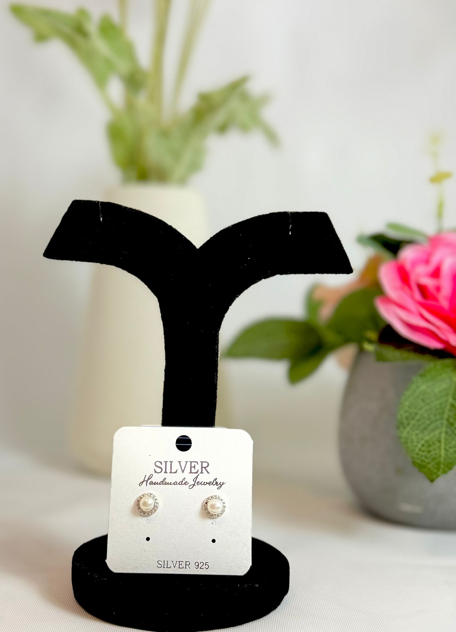 Delicate and timeless, these 925 sterling silver stud earrings feature elegant round pearls framed with a subtle sparkling border. Their classic design adds a soft, graceful touch to any look — perfect for daily wear or special occasions.