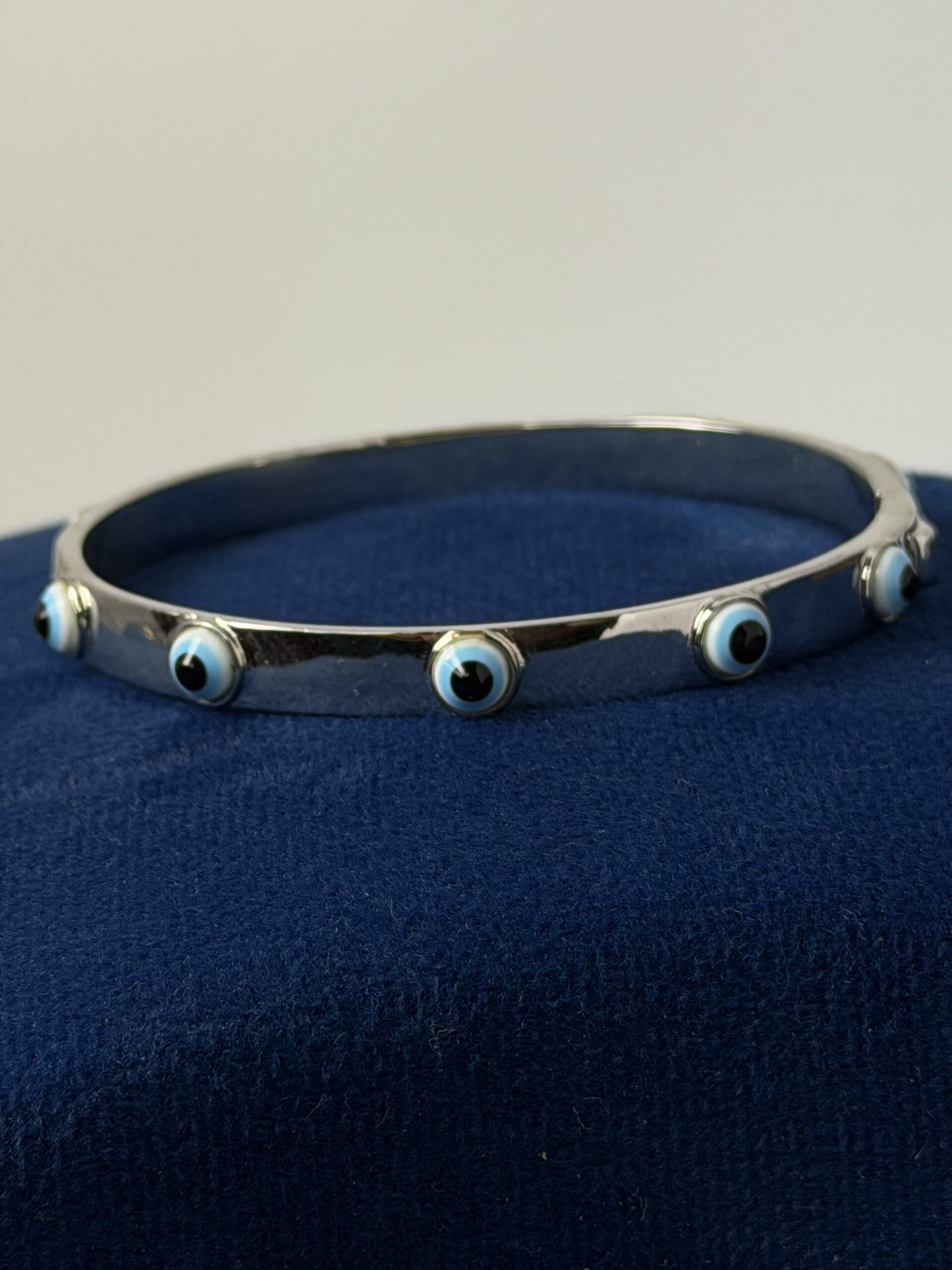 Add a touch of modern elegance and symbolic protection to your look with this stunning silver-tone evil eye bangle. Designed with a sleek polished finish, this bracelet features multiple delicate blue evil eye charms evenly spaced around the band for a minimalist yet eye-catching style.