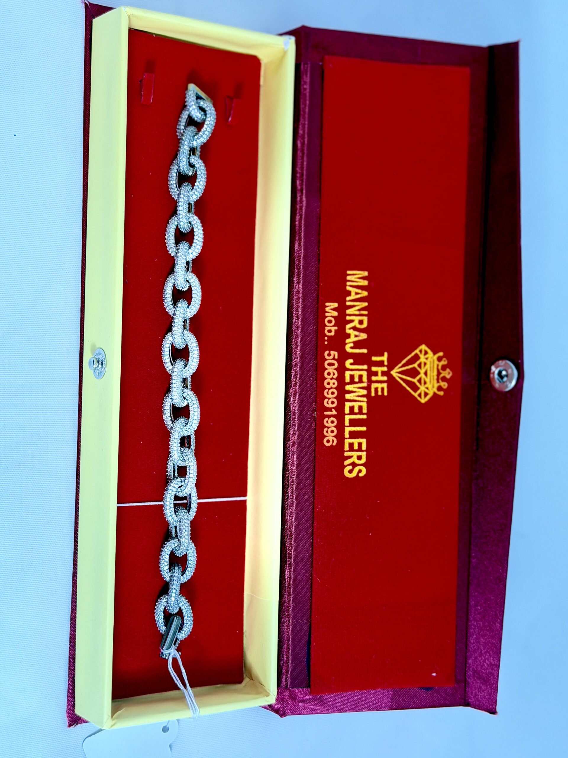 Premium Iced-Out Men’s Bracelet crafted in high-quality 925 sterling silver. This bracelet features a bold interlocking link design fully covered with sparkling iced stones, giving it a luxurious and eye-catching shine. Designed for men who love strong and stylish jewelry, this bracelet is perfect for daily wear, parties, and special occasions. A perfect accessory to elevate your style or a great gift for men who appreciate premium silver jewelry.