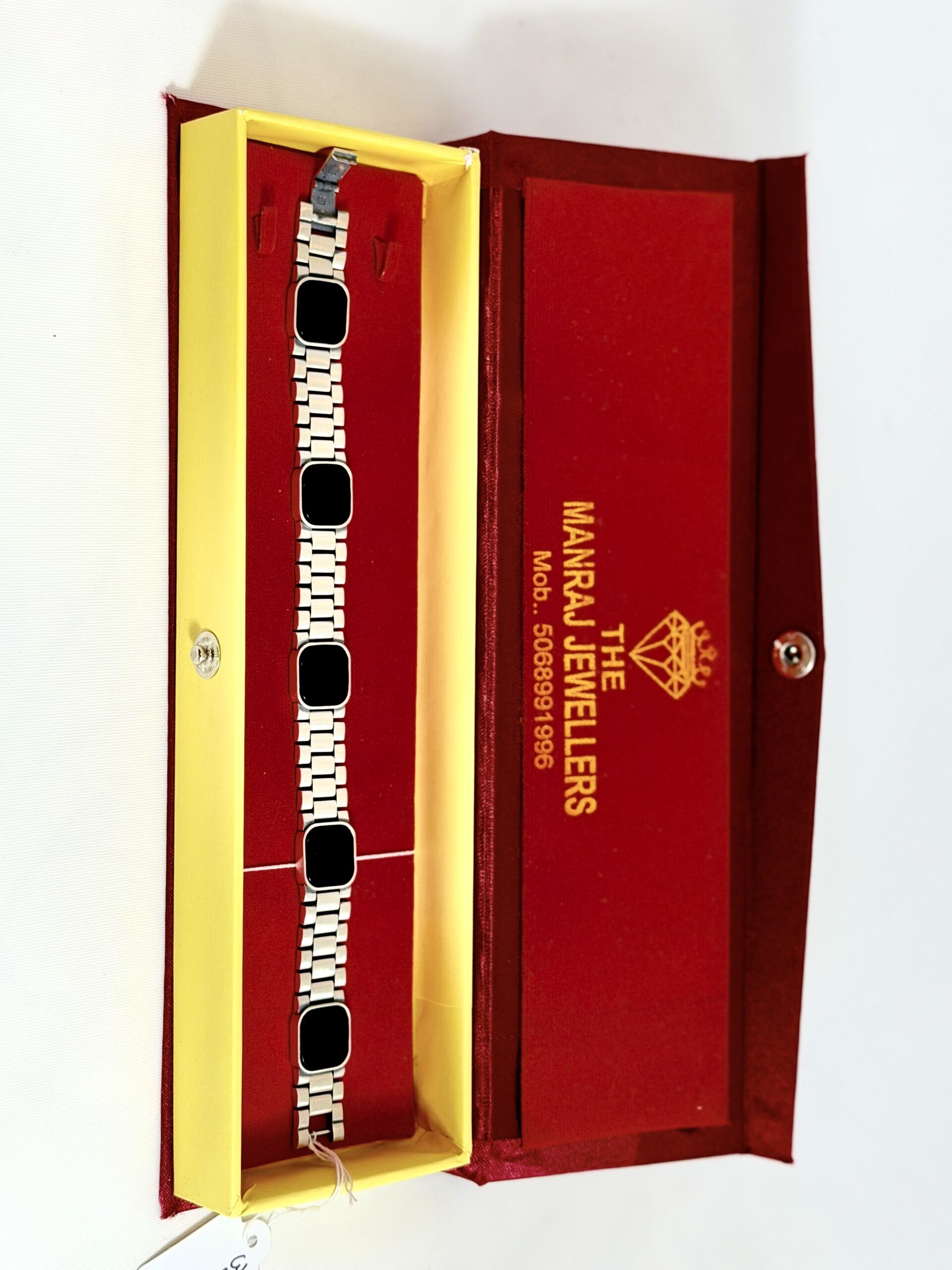A bold blend of modern design and timeless elegance. This stylish bracelet features sleek silver-tone links highlighted with striking black square stones that create a sophisticated and premium look. The balanced pattern and smooth finish make it perfect for both daily wear and special occasions.